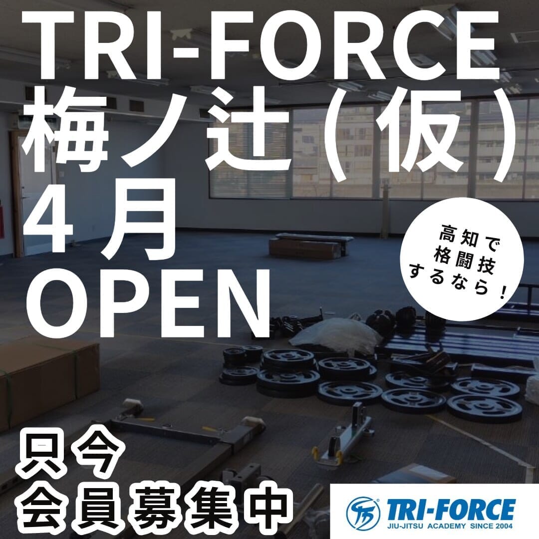 トライフォース梅ノ辻支部は、高知市梅ノ辻に新たに誕生するトライフォース高知の新拠点です。ブラジリアン柔術を中心に、キックボクシング、MMA、レスリング、ウェイトスペース、ヨガ、ピラティス、筋膜整体まで幅広く対応予定です。高知市中心部で通いやすく、初心者や未経験の方でも安心して始められる環境を整えていきます。